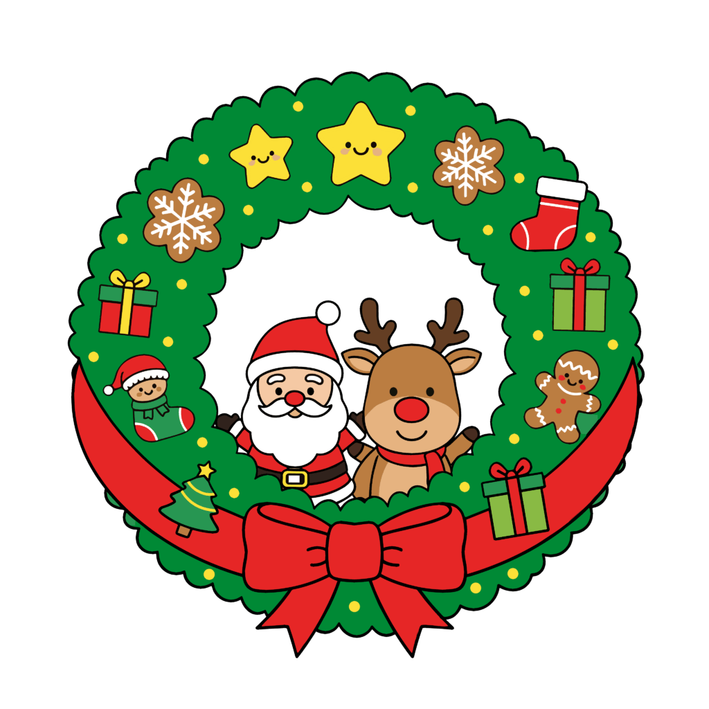 かわいいサンタとトナカイのクリスマスリースのイラスト|簡単・無料で使えるフリー素材・アイコン