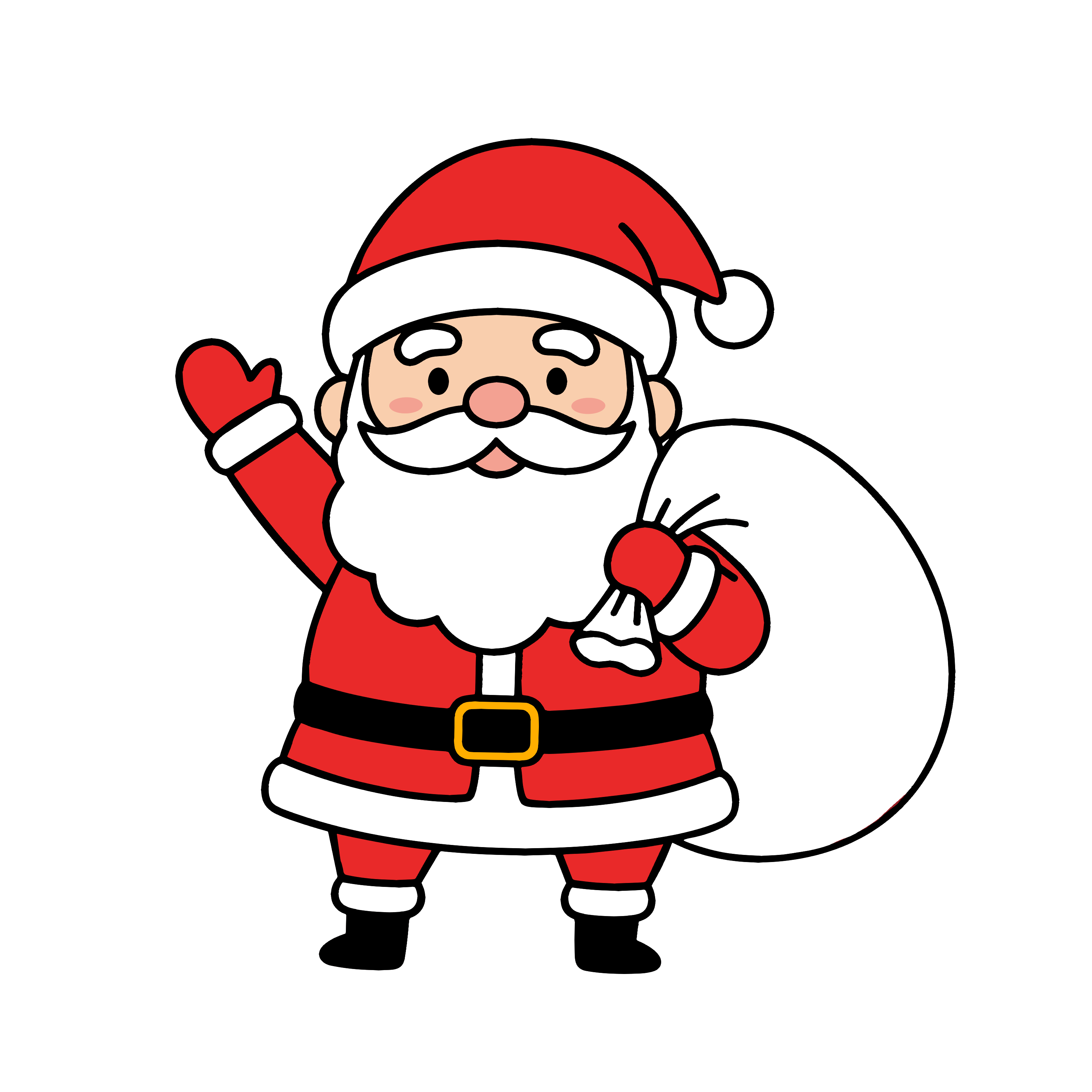 大きな袋をかついで手を振るサンタクロースのかわいいイラスト素材です。クリスマスのおたよりや園行事、装飾アイコンにぴったり。無料・簡単に使えるフリー素材として保育園やこども園で活用できます。