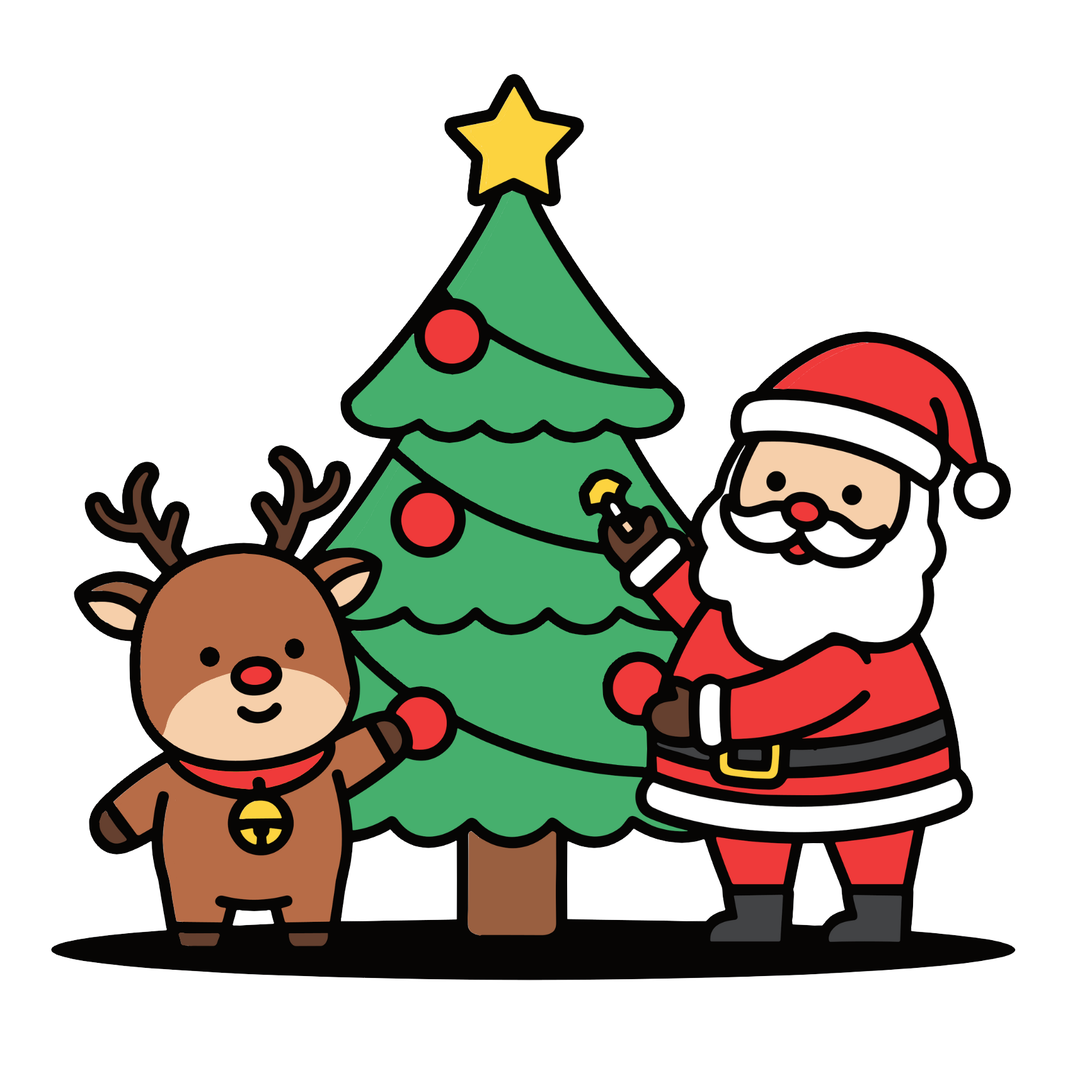 かわいいサンタとトナカイがクリスマスツリーを飾っているイラストです。冬のおたよりや行事ポスター、壁面装飾などにぴったり。保育園やこども園で使いやすい、無料の背景透過フリー素材です。季節のあそびや制作にもおすすめです。