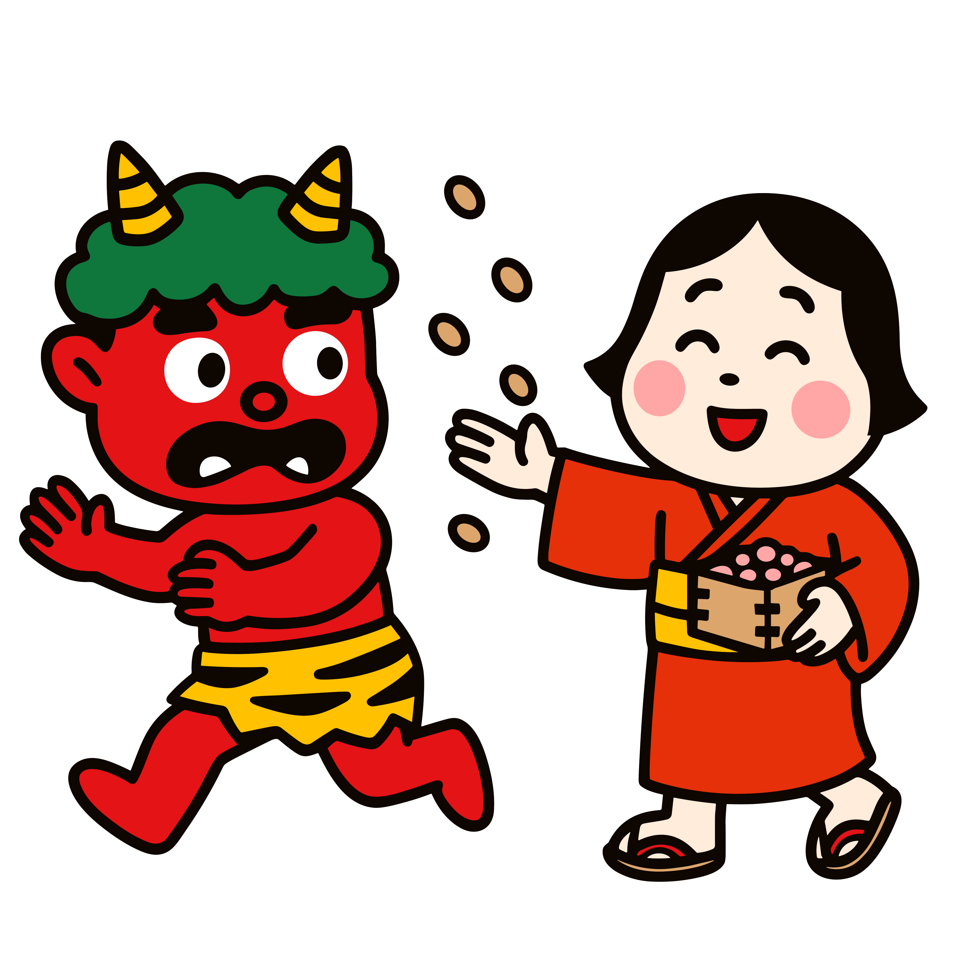 かわいい豆まきをする福の神(お多福)と逃げる赤鬼のイラスト|簡単・無料で使えるフリー素材・アイコン