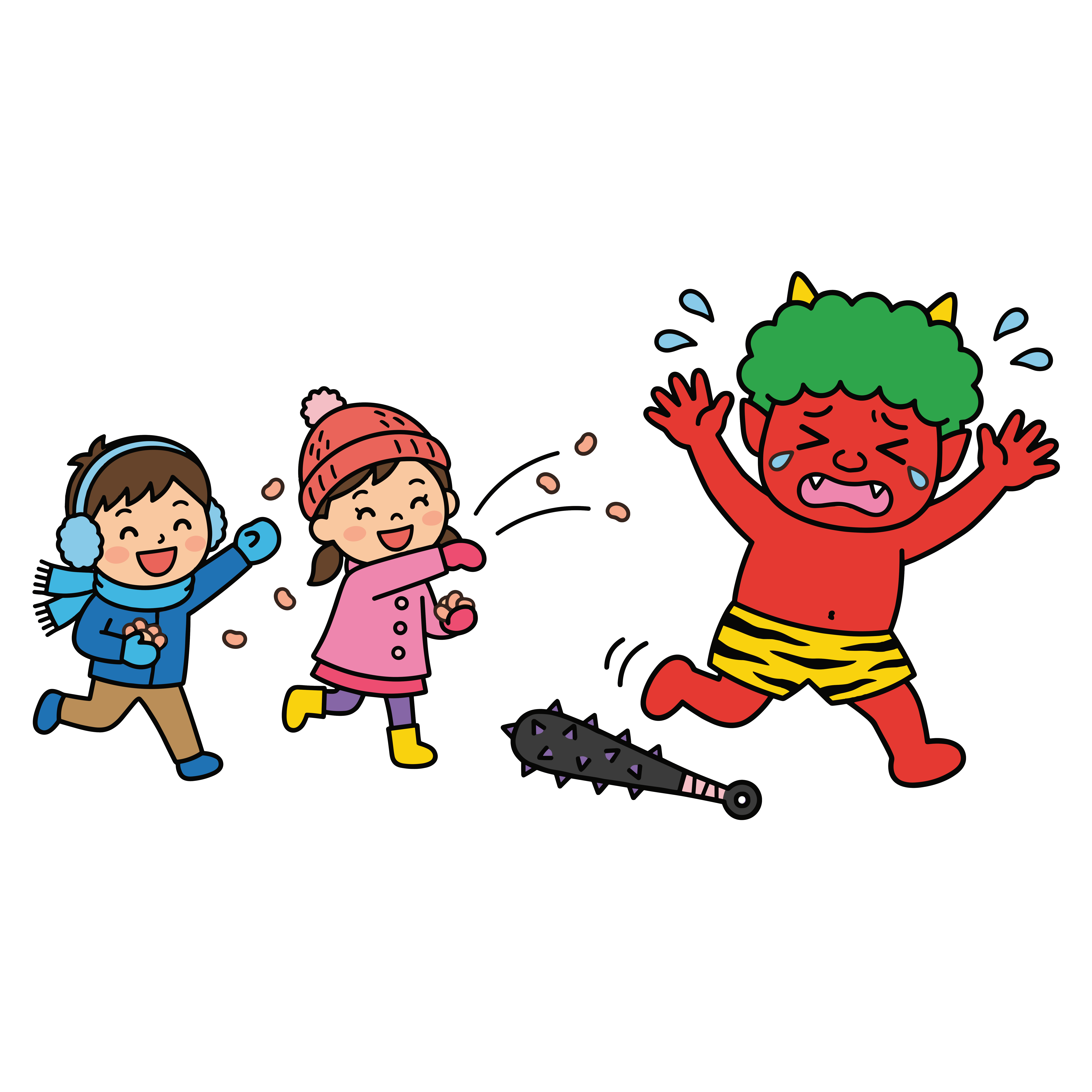 節分の豆まきで鬼を追い払うイラスト|子どもと赤鬼のかわいいフリー素材