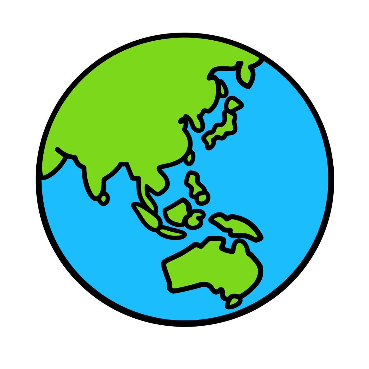 青い海と緑の大陸でシンプルに描いた地球(世界)のイラストです。かわいい線画テイストで見やすく、地理学習・世界の紹介・環境(エコ)・国際交流などのテーマに簡単に使えます。背景透過PNGなので、文字や写真の上にも重ねやすく、ブログやSNS、動画、資料作成にも便利な無料イラスト素材です。