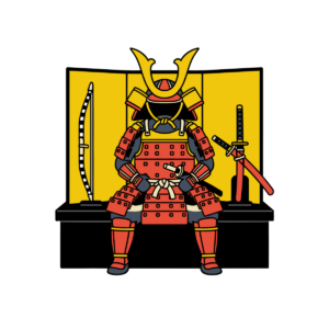 金色の兜をモチーフにした五月人形風のイラストです。落ち着いた配色ながらもかわいい雰囲気で、こどもの日や5月の季節感を簡単に表現できます。背景透過PNGのため、さまざまな制作物に使いやすい無料素材です。