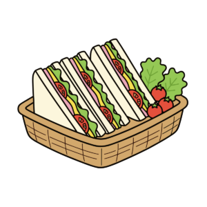 背景透過PNG形式のため、写真や文字の上に重ねても自然に配置できます。Web制作、動画編集、印刷物などさまざまな用途で簡単に使える、かわいいピクニック弁当イラストの無料素材です。